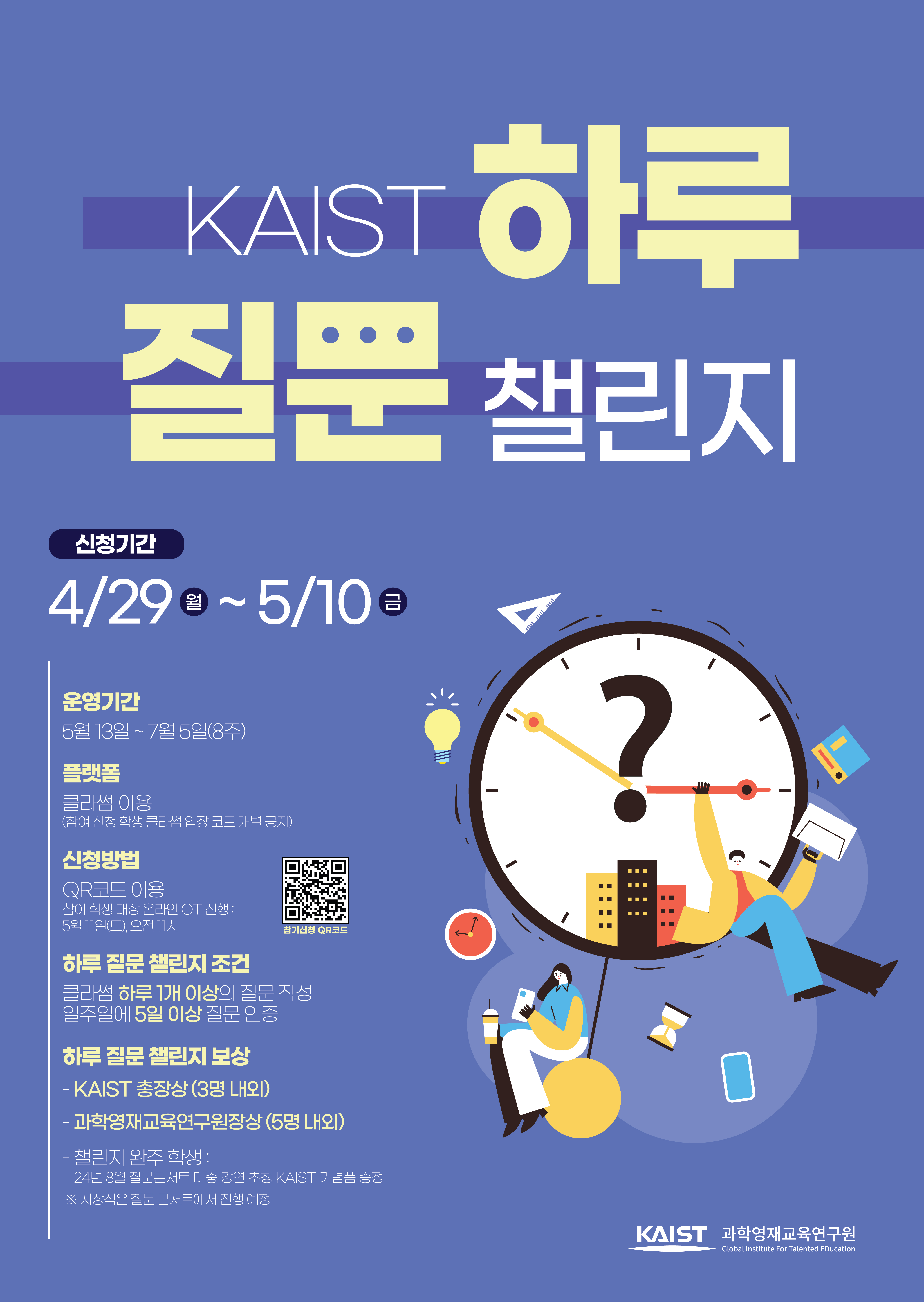 KAIST에서는 학생들의 질문 역량 증진 및 습관 형성을 위하여 2024년 5월 13일부터 7월 5일까지 8주간 KAIST 하루질문챌린지를 운영하려고 합니다. KAIST 하루질문챌린지는 매일 한개 이상의 질문을 일주일에 5일 이상 클라썸을 통해서 인증을 하면 챌린지를 완주하게 되는 프로그램으로, 영재키움프로젝트 학생을 대상으로 운영하려고 합니다. 참여하고자 하는 학생은 아래 설문에 참여 부탁드립니다. 자세한 내용은 첨부 파일을 참조해주세요.