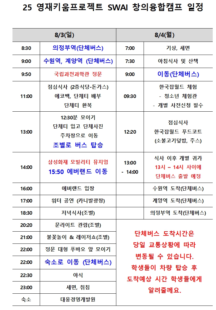 폭염으로 인한 SWAI 창의융합캠프 장소 및 일정 변경 하게 되었습니다. 에버랜드는 구조상 그늘이 없고 야외체험이 많아 학생들의 안전을 위해 부득이하게 일정과 장소를 변경합니다. 실내 과학관과 박물관 견학 후 에버랜드는 저녁시간에 이용하고자 하오니 양해부탁드립니다. 일정은 아래 첨부 파일을 참고해주세요. 장소 변경으로 이동 차량 수정 및 문의사항은 카카오채널을 통해 부탁드립니다. 문의사항이 많아 채널상에 남아있는 자료로 확인을 하고 수정 후 개별로 답변을 드릴 수 있어 꼭 채널로 수정 및 문의 부탁드립니다. 전화 주셔도 채널로 문의 부탁드린다고 공지드릴 예정입니다. 채널의 내용 확인 후 개별로 답변 드리겠습니다.