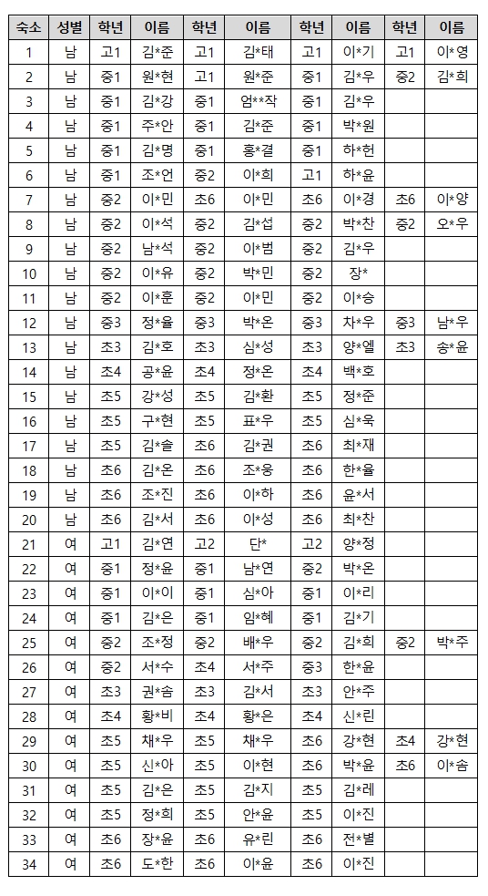 형제, 자매, 같은 학교 학생들과 함께 할 수 있도록 배정하였습니다. 개인정보로 이름을 모두 공개하지 못합니다. 성별상 문제가 없다면 수정은 못해드립니다. 양해 부탁드립니다.