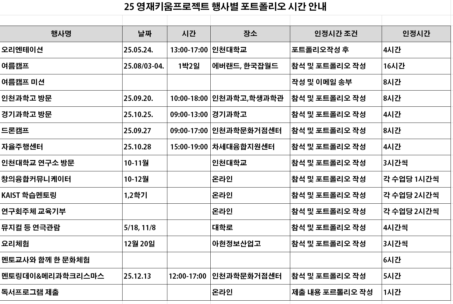 인천대학교 영재키움 프로젝트 25년 포트폴리오 작성 시간 기준입니다. (상황에 따라 변동될 수 있습니다.)