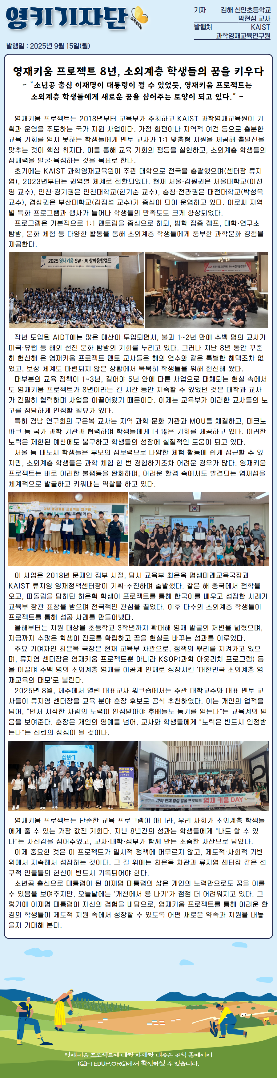 영키 기자단 기사(2025.9.15)_영재키움 프로젝트 8년, 소외계층 학생들의 꿈을 키우다_김해신안초등학교 교사 박현성