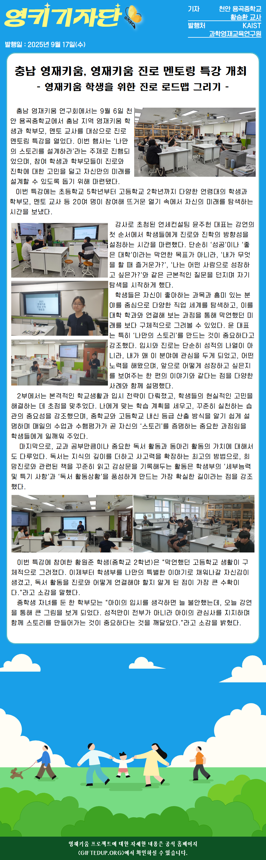 영키 기자단 기사(2025.9.17)_충남 영재키움, 영재키움 진로 멘토링 특강 개최 _천안용곡중학교 교사 황승환