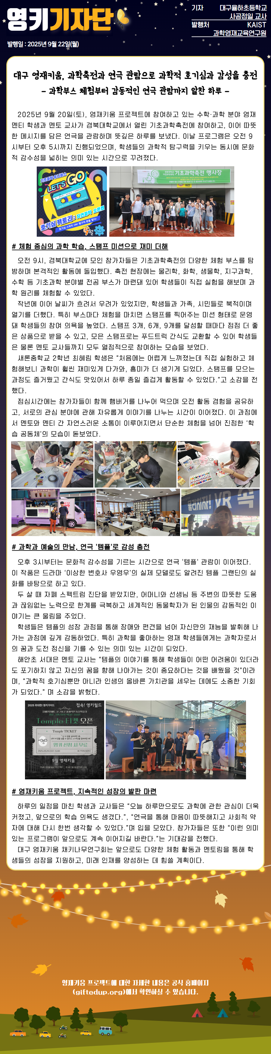 영키 기자단 기사(2025.9.22)_대구 영재키움_과학축전과 연극 관람으로 과학적 호기심과 감성을 충전하다_율하초등학교 교사 사공정일