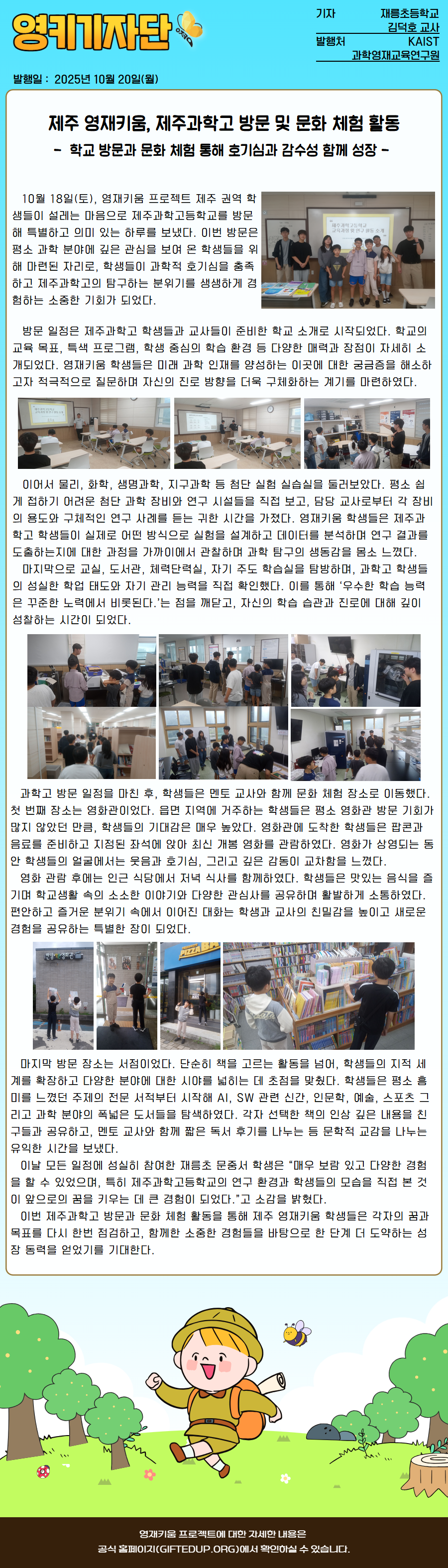 영키 기자단 기사(2025.10.20)_제주 영재키움, 제주과학고 방문 및 문화 체험 활동_재릉초 교사 김덕호