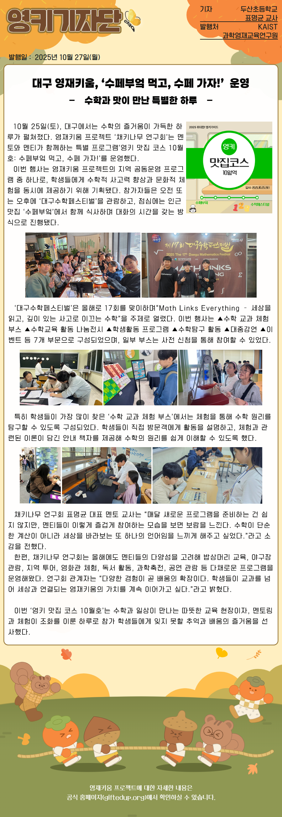 영키 기자단 기사(2025.10.27)_대구 영재키움, '수페부엌 먹고, 수페 가자!' 운영_두산초 교사 표명균