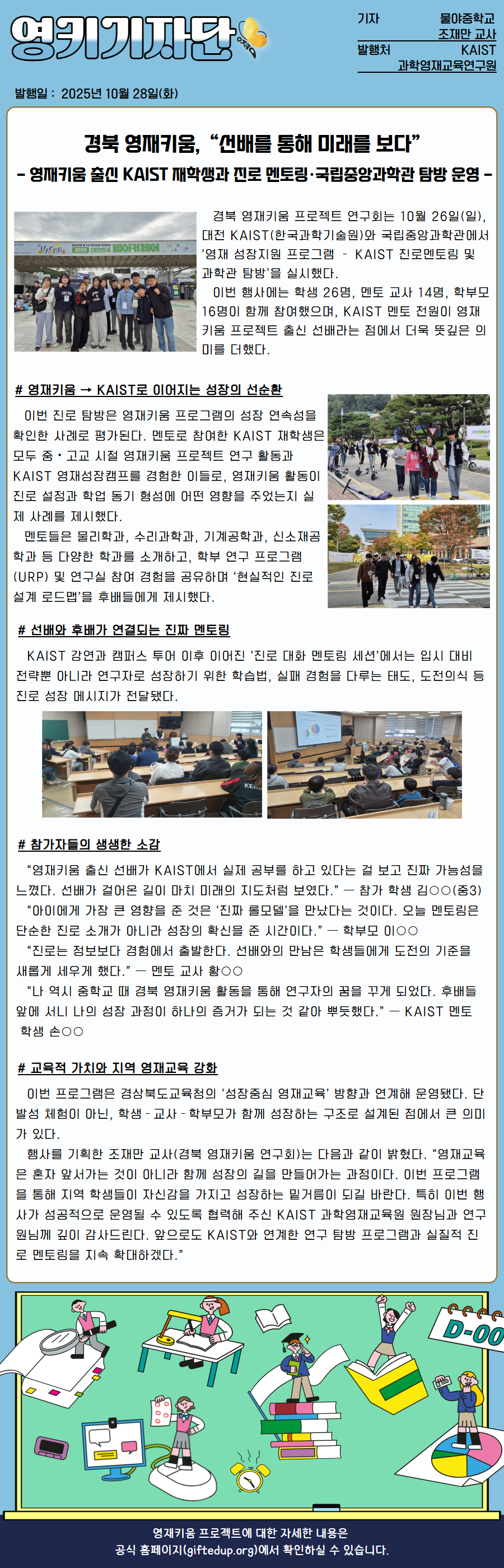 영키 기자단 기사(2025.10.28)_경북 영재키움, "선배를 통해 미래를 보다"_물야중 교사 조재만