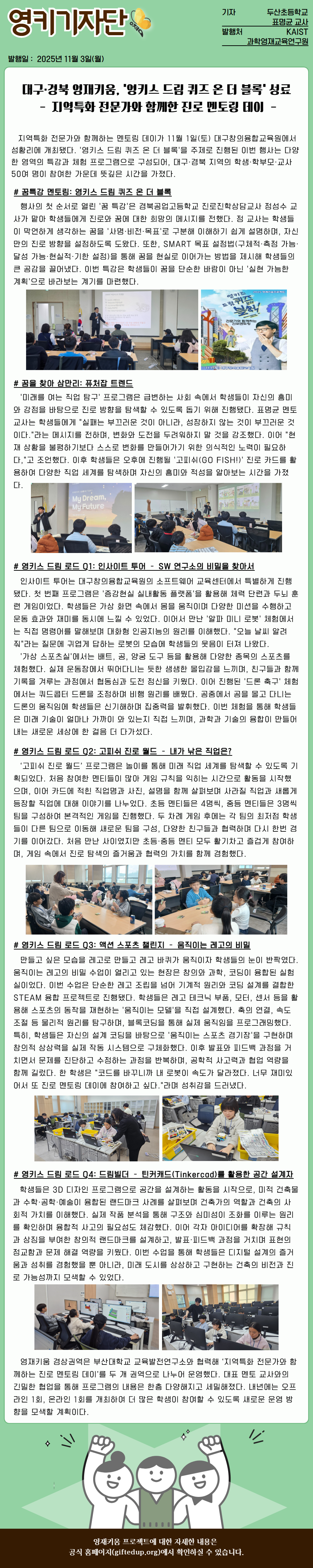 영키 기자단 기사(2025.11.03)_대구경북 영재키움, '영키스 드림 퀴즈 온 더 블록' 성료_두산초 교사 표명균