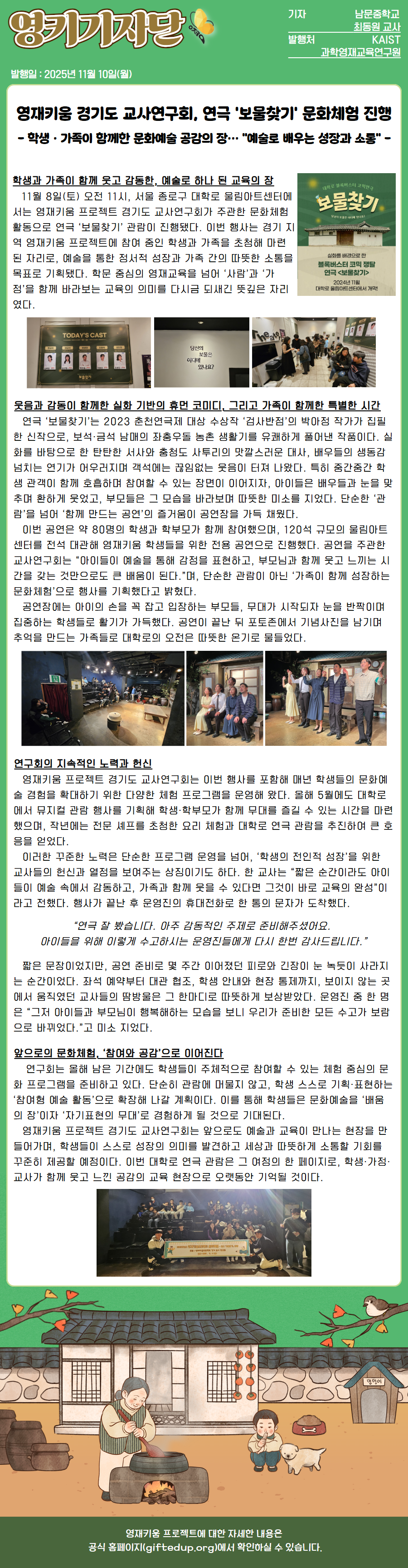 영키 기자단 기사(2025.11.10)_영재키움 경기도 중등 연구회, 연극 '보물찾기' 문화체험 진행_남문중 교사 최동원