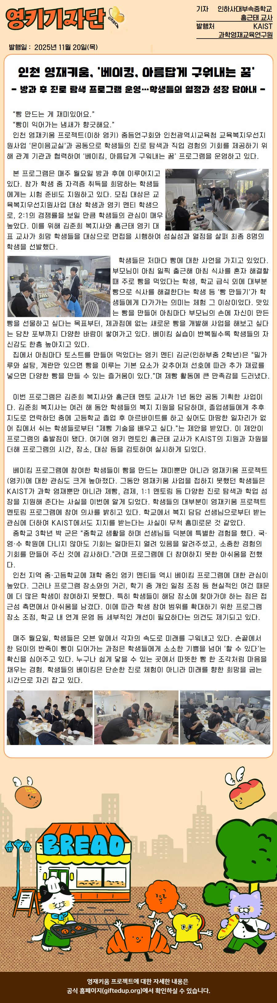 영키 기자단 기사(2025.11.20)_인천 영재키움, '베이킹, 아름답게 구워내는 꿈'_인하사대부속중 교사 홍근태