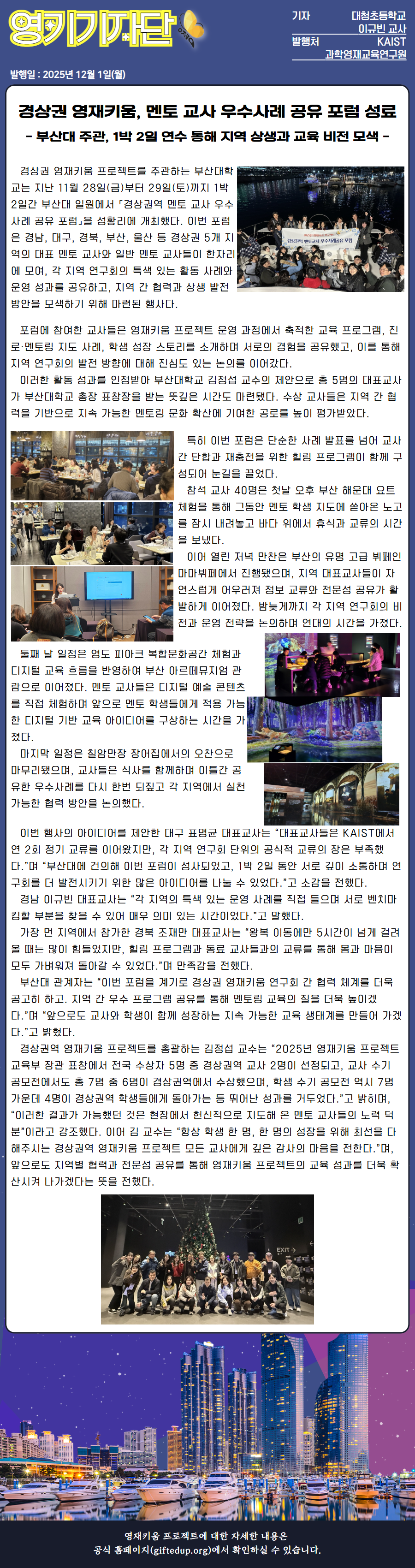 영키 기자단 기사(2025.12.08)_경남 영재키움, 12시간 동행 멘토링으로 꿈을 키우다_대청초 교사 이규빈