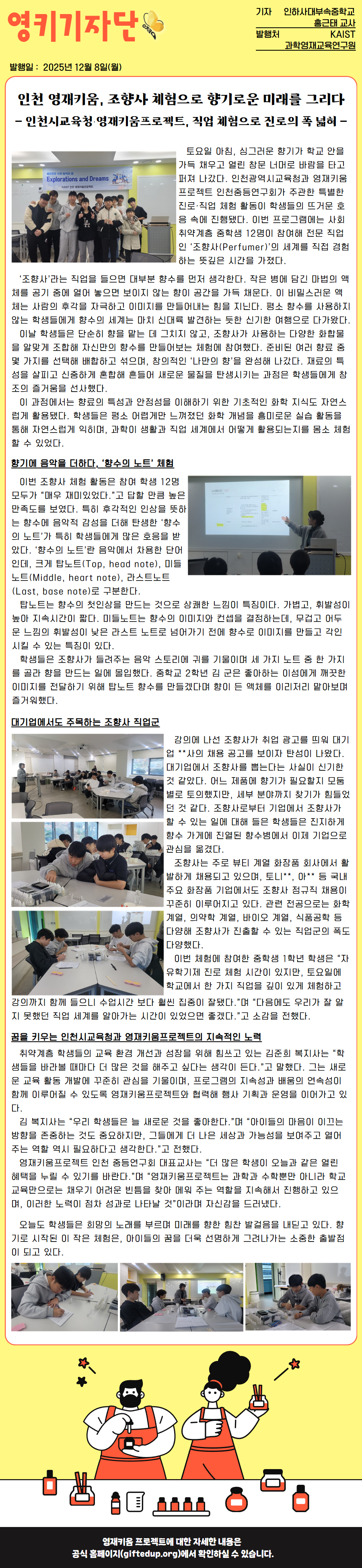 영키 기자단 기사(2025.12.08)_인천 영재키움, 조향사 체험으로 향기로운 미래를 그리다_인하사대부속중 교사 홍근태