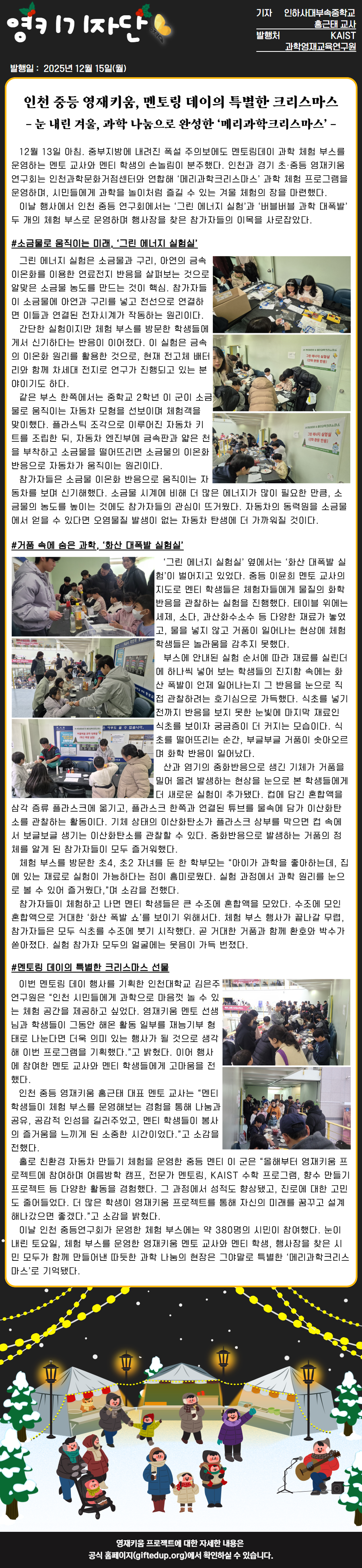 영키 기자단 기사(2025.12.15)_인천 중등 영재키움, 멘토링 데이의 특별한 크리스마스_인하사대부중 교사 홍근태