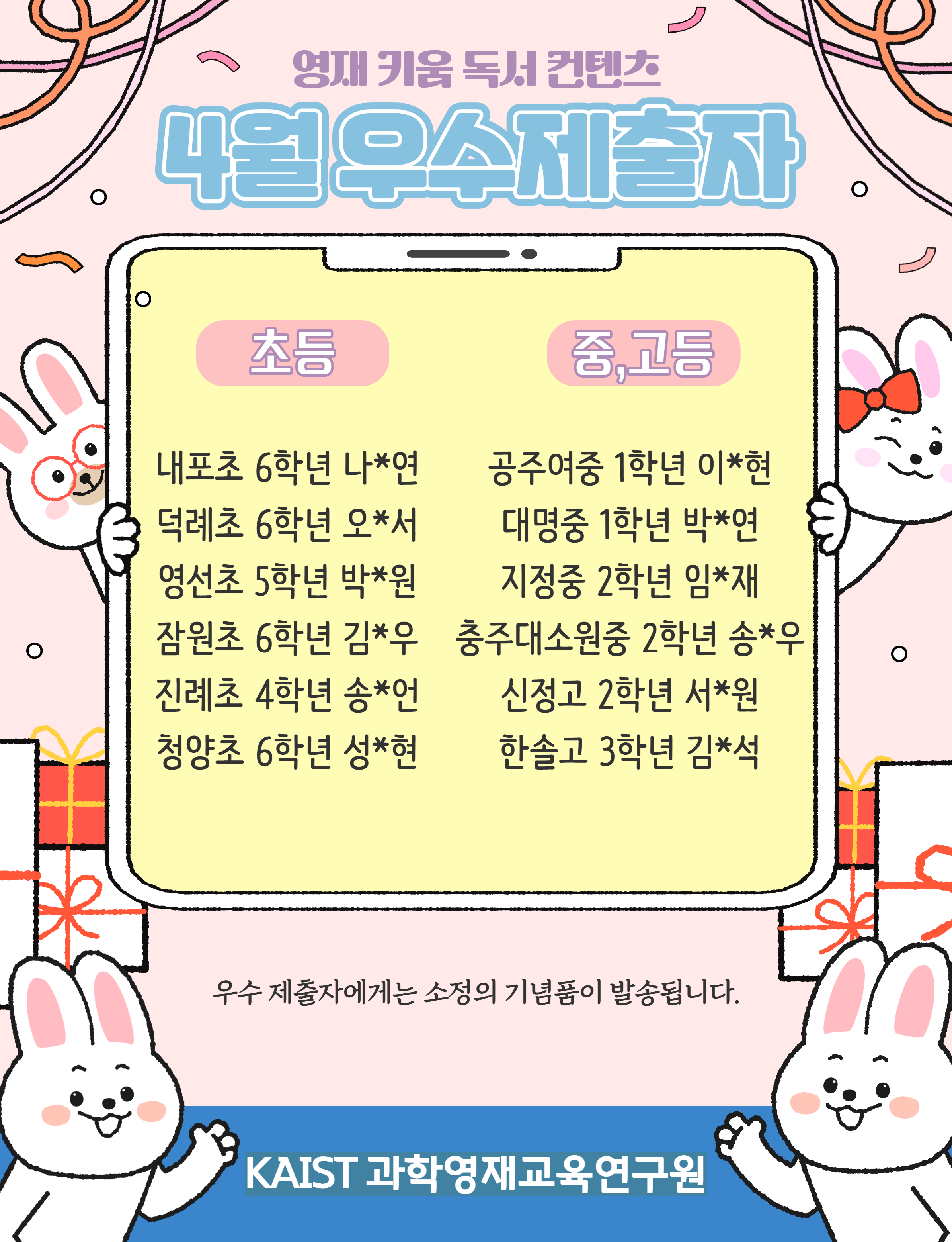 | 29 | 온라인학습 멘토링 | [2024-4] 4월 독서 프로그램 우수자 발표 | 카이스트 | 2024-05-20 | |