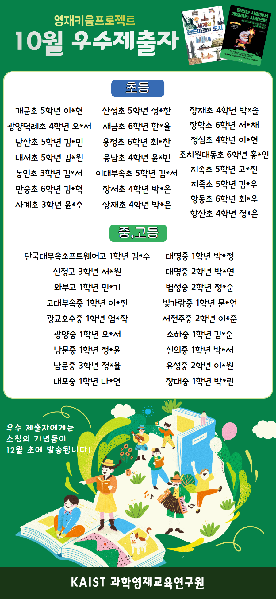 | 67 | 온라인학습 멘토링 | [2025-10] 10월 독서 프로그램 우수자 발표 | 카이스트 | 2025-11-20 | |